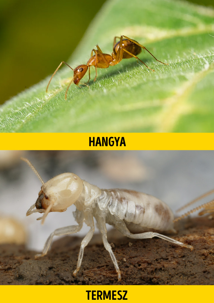 Oké, azt azért nem nehéz megmondani, hogy hangya vagy termesz van az otthonunkban, hiszen amíg előbbiek csak maximum morzsák és egyéb élelmek reményében lepik el a házunkat, addig utóbbiak felzabálják a ház gerendáit és a fa bútorokat. Ha a szabadban kell azonban különbséget tennünk közöttük, akkor nem árt, ha tudjuk, hogy a termeszek teste sokkal vastagabb, míg a hangyák dereka karcsú.