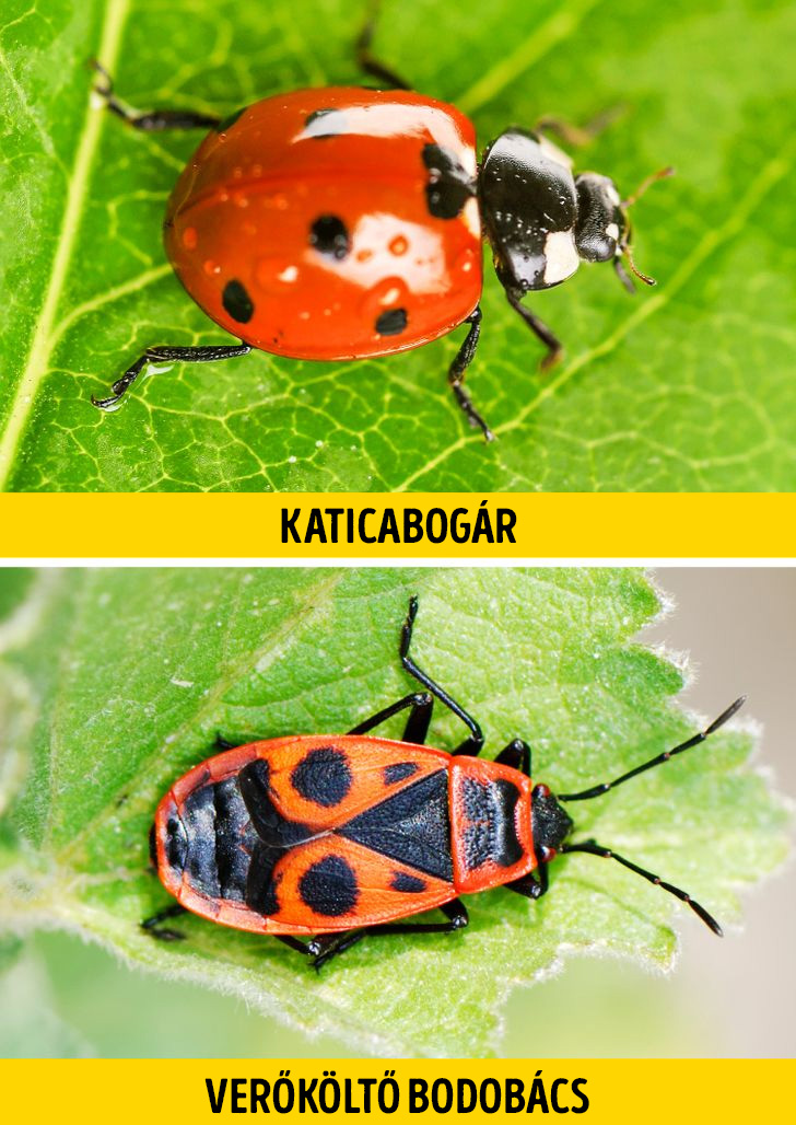 Közelről kell szemügyre vennünk őket, hogy megtaláljuk a különbségeket, mivel mindketten aprók, vörösek, és a hátukon foltosak. De nagyjából ezzel a hasonlóságok végére is értünk. A verőköltő bodobács valójában egy poloskafajta, ami hosszú testtel és nagy csápokkal rendelkezik. A katicabogarak ezzel szemben gömbölyűek, apró antennáik vannak, és sokkal aranyosabbak.
