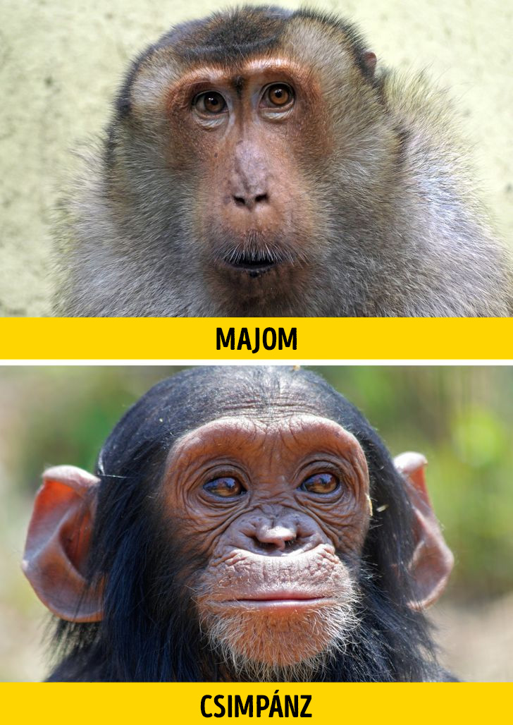 Mi? Hát a majmok és a csimpánzok nem ugyanazok? Nos, nem. A csimpánzok nem tartoznak a majomfaj közé, ahogy a sokszor szintén idevett gorillák sem. Érdemes megfigyelni, hogy a majmok kisebbek, és szőrösebbek, míg a leglátványosabb különbség mégis az, hogy a csimpánzok a majmokkal ellentétben nem rendelkeznek farokkal.