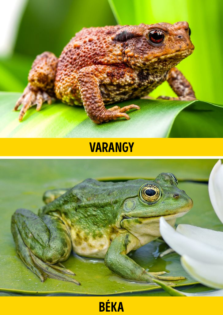A békák és a varangyok közel sem annyira hasonlóak, mint gondolnánk. Ebből adódóan könnyedén megkülönböztethetők: a békák kisebbek, bőrük pedig simább. A varangyok ezzel szemben jóval robusztusabbak, izmosabbak, lábujjaik pedig rövidebbek, mint a békáké.