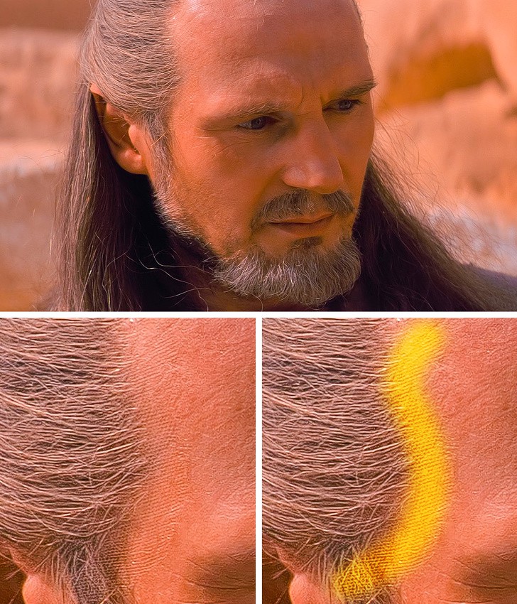 Némelyik jelenetben egyértelműen látható a technológia, amivel a szereplők parókáit készítették. A fenti képen például világosan látható, hogy ez nem Liam Neeson valódi haja.