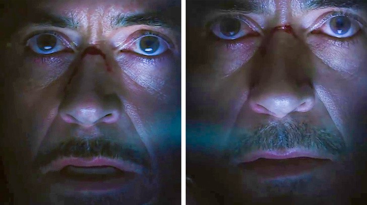Robert Downey-Junior egy pillanat alatt megváltoztatja a bajuszát. És teszi mindezt úgy, hogy közben végig Iron man öltönyben van. Nyilvánvaló, hogy itt a jelenetek forgatása között sok idő telt el.