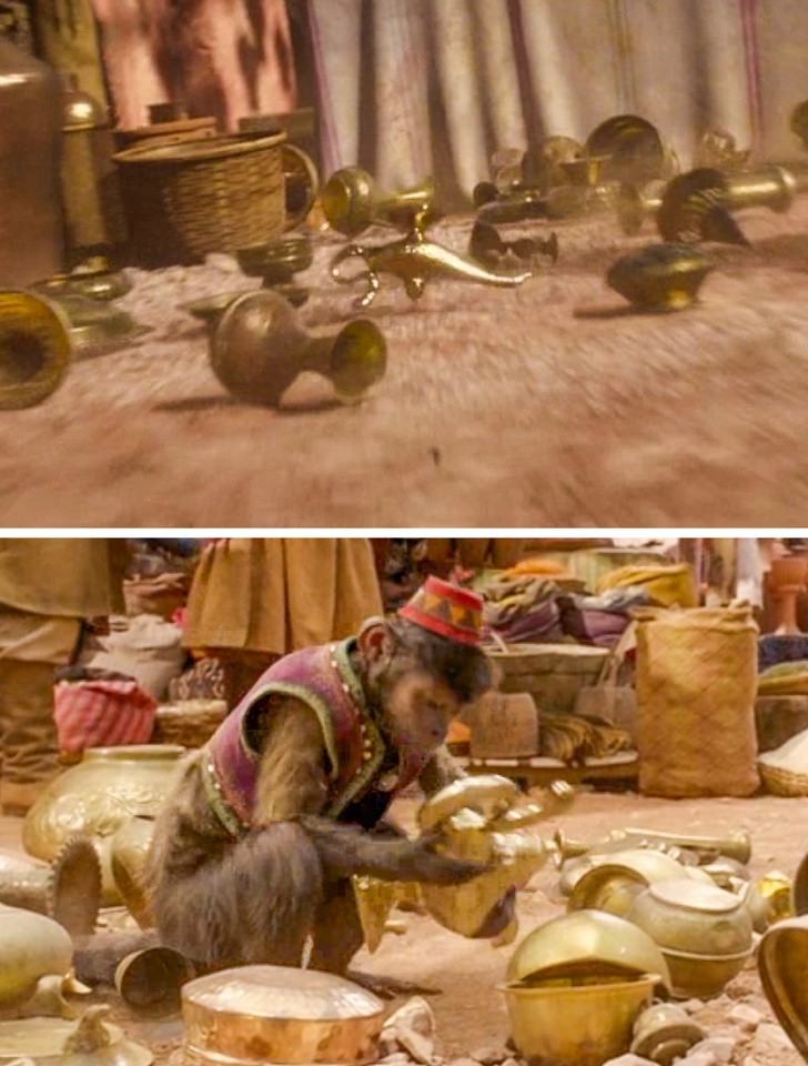 A film üldözéses jelenetében Jasmine eldobja a mágikus lámpát, majd Abu felveszi, de mint a képen is látható: rossz lámpát vesz fel. Itt a szereplőknek valószínűleg vissza kellett menniük az eredeti lámpáért, de ezeket a jeleneteket vagy kivágták, vagy hibáztak egy nagyot a készítők.