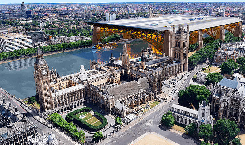A repülőtérnek eredetileg a Parlament épülete mellett állt volna, a Wstminster-híd és a nemrég átadott Lambeth-híd között. A tervek szerint elég magas lett volna ahhoz, hogy a hajók átférjenek alatta, a repülőgépek pedig biztonságosan le tudjanak szállni a tetején, ám végül sosem valósult meg.