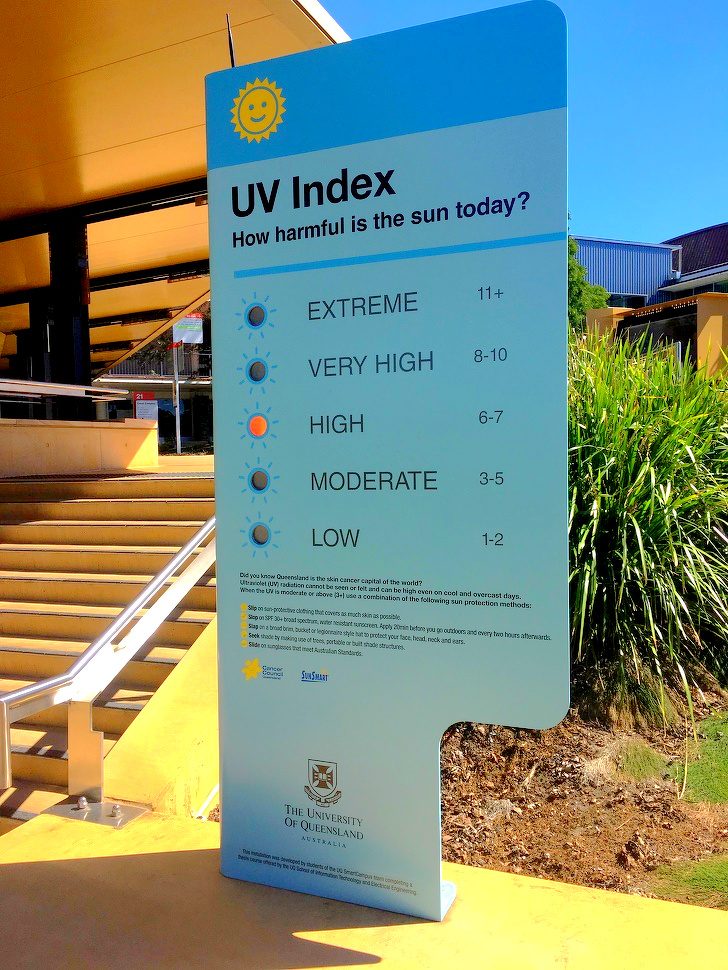 Mivel Ausztráliában olyan erős az UV sugárzás, hogy már percek alatt is komoly égési sérüléseket okozhat, ezért az utcákon különböző UV-jelző táblák mutatják, hogy mikor a legbiztonságosabb az utcára merészkednünk. Az ilyen tábláknak hála az emberek könnyebben betájolhatják, hogy mikor menjenek el intézni az ügyes-bajos dolgaikat, vagy mikor engedjék ki a gyermekeiket játszani a többi gyerekkel.