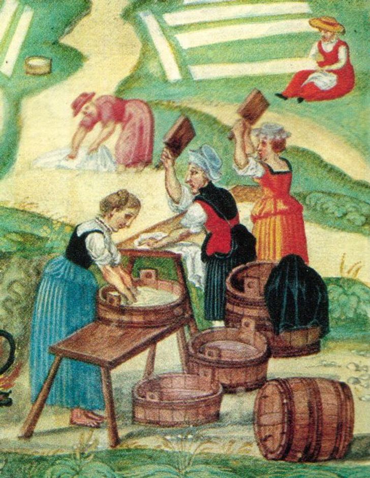 A jó mosodai lúg előállításához a legfontosabb alapanyag a hamu és a vizelet volt. Nemcsak a foltok eltávolítására és fehérítéshez, hanem a zsír és faggyú hatékony eltávolítására is használták ezeket. A ruhadarabokat ezután kerítésekre, bokrokra és faágakra akasztva szárították.