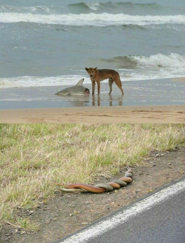 Ez a fotó remekül szemlélteti Ausztrália lényegét: vérszomjas dingó, cápa, mérgeskígyók. Ha pedig ezek közül egyiknek sem sikerül megölnie, akkor még mindig ott van a Nap, aminek 10-szer magasabb az UV sugárzása, mint bárhol Európában, így akár már fél óra napon történő séta is bőrrákot okozhat.
