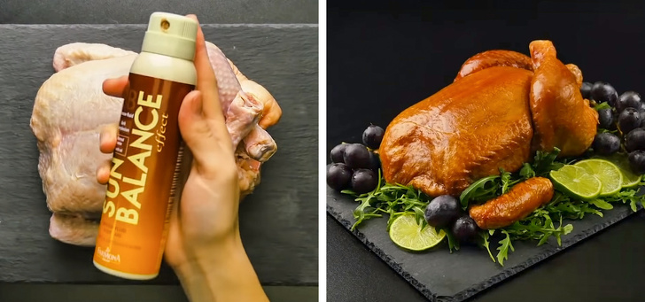Más esetekben a nyers csirkét speciális festékekkel, barnítókrémekkel és cipőfestékkel kenik be a tökéletes hatás kedvéért.