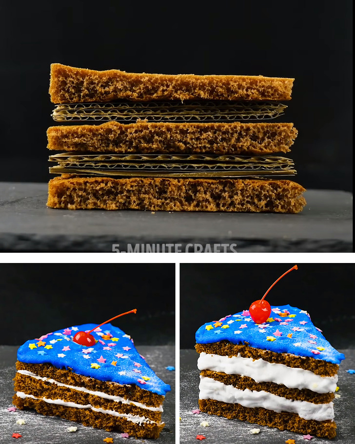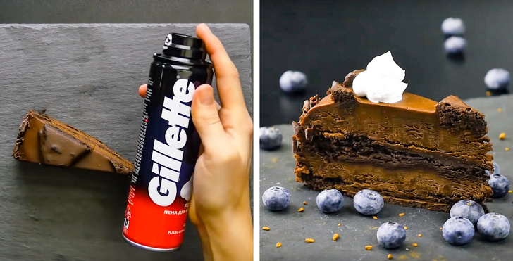 Akárcsak a hamburgerek esetében, a tortaszeleteknél is elengedhetetlen, hogy tökéletesen és magabiztosan mutassanak a képernyőn. Az étvágygerjesztő többrétegű desszerteket épp ezért kartonpapírral bélelik ki, majd egyszerűen tejszínnel teszik láthatatlanná.
