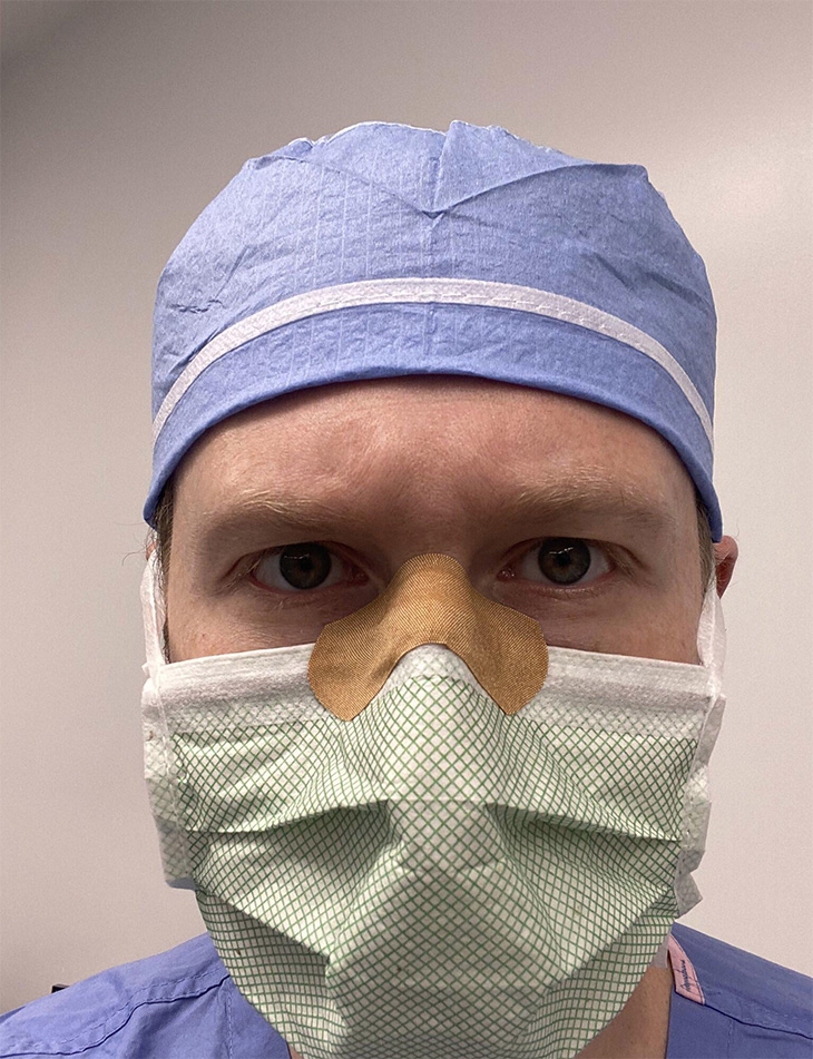 18. Végezetül: a szájmaszk tetejére rakott ragtapasszal megakadályozhatjuk, hogy elmozduljon a szájmaszk, és hogy bepárásodjon a szemüvegünk.