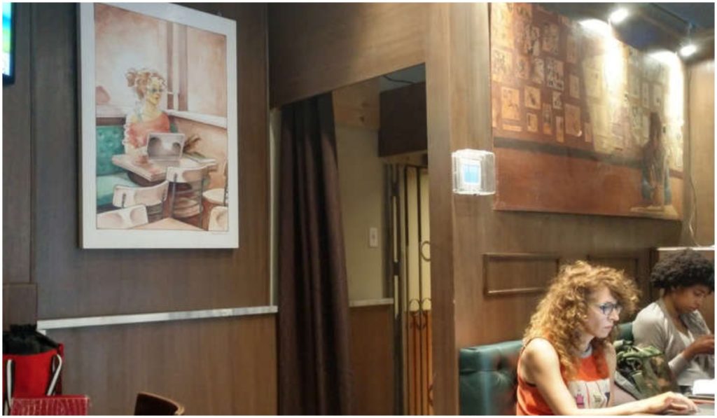 Az asztalnál ülő és a festményen szereplő nő között elképesztő a hasonlóság.