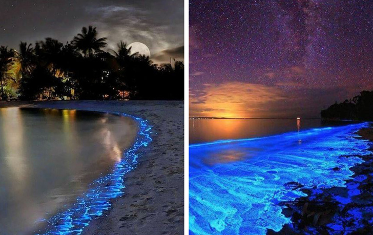A Maldív-szigeteken a páncélos ostorosok, amik tulajdonképpen fitoplanktonok, kémiai reakcióval hozzák létre ezt a csodálatos kék fényt.
