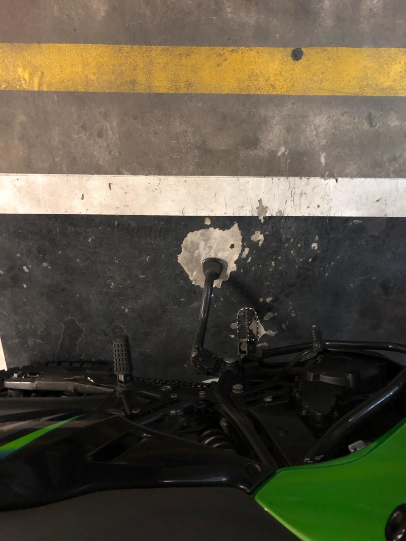 14. Egy motoros parkolóhely, aminél túlnyomó többségben ugyanott teszik le a kitámasztót a motorosok.