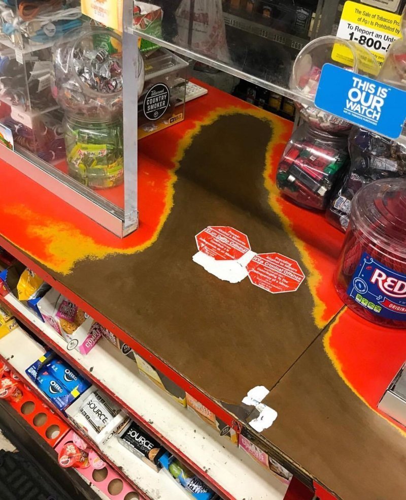 8. Ennek a pénztárnak a pultján jól látható, hogy hol csúsztatják át egymásnak a termékeket a vásárlók és az eladók.