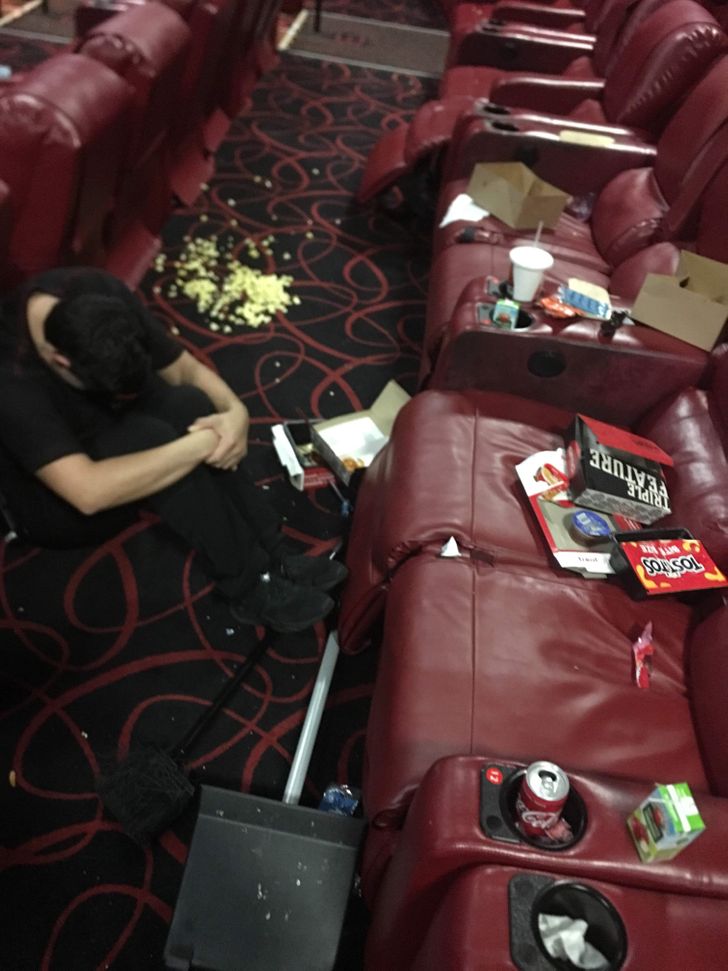 2. ,,Moziban dolgozom. Ilyen rendetlenség maradt az egyik teremben a közönség után. Kérjük, hogy tartsd tiszteletben a személyzetet, és takaríts össze magad után.”