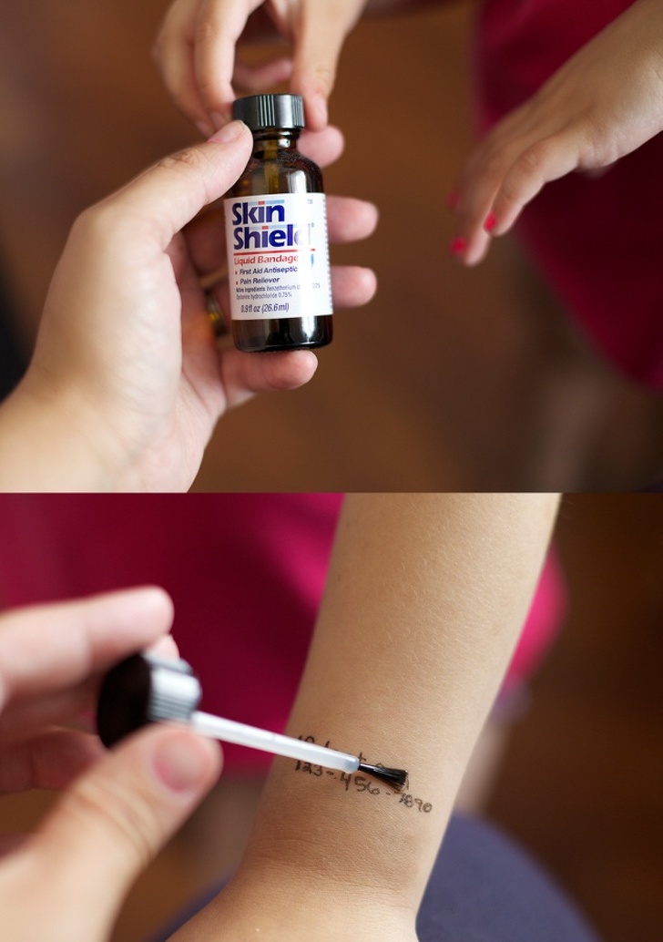 6. Alkoholos filc segítségével készítsünk ideiglenes tetoválást a gyermekünkre a legfontosabb adatainkkal, ha nagy nyilvános rendezvényre megyünk és attól félünk, hogy esetleg elveszik. Utána ezt egy körömlakklemosó segítségével könnyedén eltávolíthatjuk.
