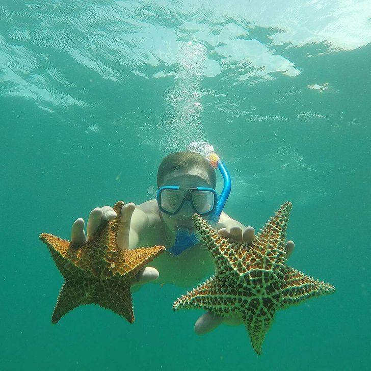 - Ha tengeri csillaggal szeretnél fényképezkedni, akkor jobb, ha nem veszed ki a vízből maximum 3-5 másodpercnél tovább, ilyenkor ugyanis a csillagok víz helyett levegőt szívnak magukba, és ha túl sok kerül a testükbe, akkor többé nem lesznek képesek a víz fenekére süllyedni, előbb-utóbb pedig elpusztulnak.