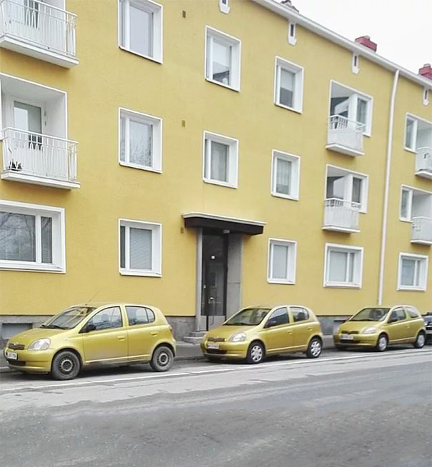 12. Három ugyanolyan színű és típusú autó egy ugyanolyan színű ház előtt.