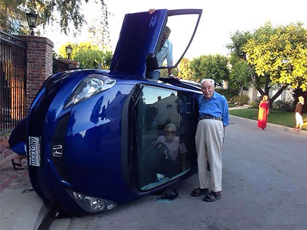 2. Ez az idős házaspár úgy döntött, hogy összeáll egy fotóra, noha az autójuk még mindig az oldalán van, a feleség pedig beszorulva a belsejébe.