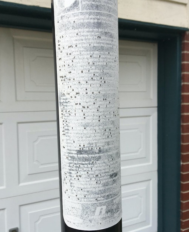 12. Egy villanyoszlopra ragasztott plakát, amit kiszívott a nap, de egyes betűi mégis épségben maradtak.