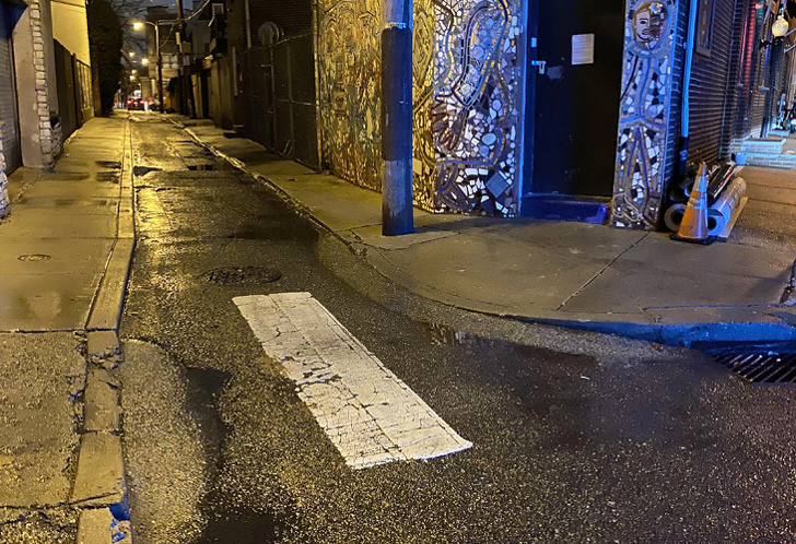 12. Ez az utca annyira keskeny, hogy csak egy fehér csíkra volt szükség a gyalogátkelőhely felfestéséhez.
