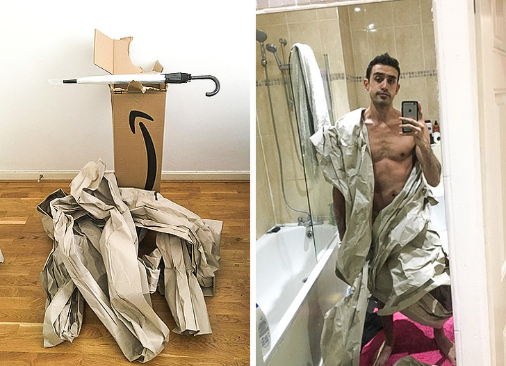 1. Csak egy esernyőt szeretett volna rendelni, nem is gondolt rá, hogy a mellé csomagolt papírból saját tógát készíthet majd magának.