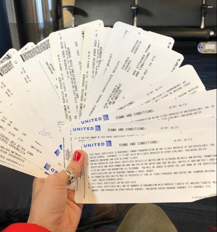 16. ,,A nővérem repülőgépe nem tudott felszállni a köd miatt a Pittsburgh-i repülőtéren, és el kellett halasztanunk a karácsonyt. Bármelyik későbbi járattal próbált meg indulni, végül mindegyiket törölték. Ezek a képen a beszállókártyái. Egyébként a poggyásza is elveszett, noha egyetlen repülőgépe sem szállt fel soha.”