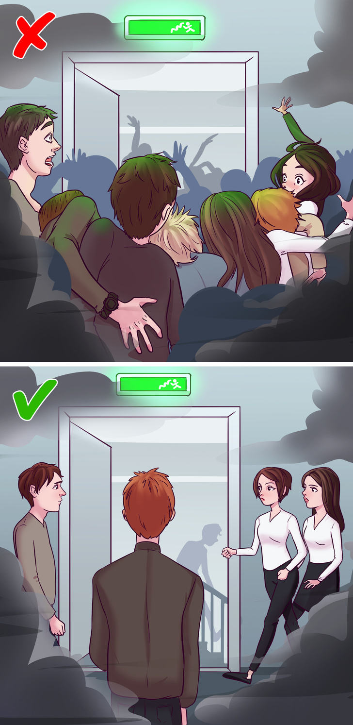 Ha az egyik kijárathoz vezető lépcsőházban az emberek feltorlódnak, az annak a jele, hogy a kijárat zárva van. Minél hamarabb hagyjuk el ilyenkor a lépcsőházat, a kétségbeesett tömeg ugyanis félelmetes pusztításra képes.