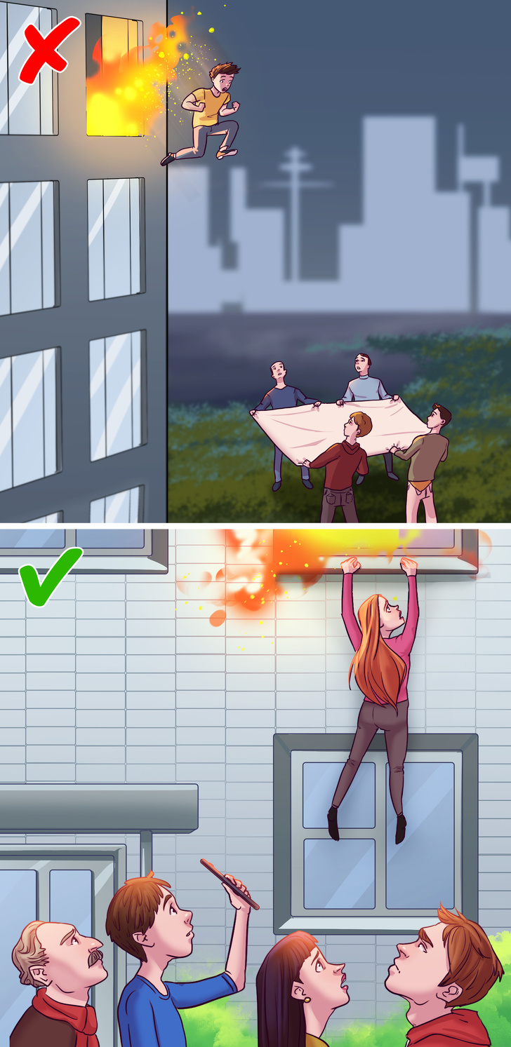 Ha ugrani akarunk az ablakból, a legjobb, ha csökkentjük a köztünk és a föld között lévő távolságot. Ezt legegyszerűbben úgy érhetjük el, hogy az ablakpárkányra csimpaszkodunk. Benne van, hogy eltörjük a lábunk, de nagy az esély a túlélésre. Gyerekek, idős emberek és terhes nők számára azonban ez is életveszélyes lehet.