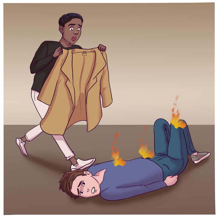Ha egy másik ember ruhája gyullad ki, mindig egy szőnyeg vagy vastag ruhadarab, például kabát segítségével próbáljuk eloltani.