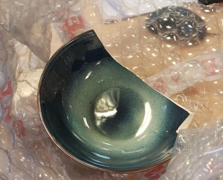 8. ,,Egy kollégám tálat rendelt az internetről, de ezt kapta kézhez. A csomagban nem volt ott a letört rész, szóval valószínűleg így adták fel.”