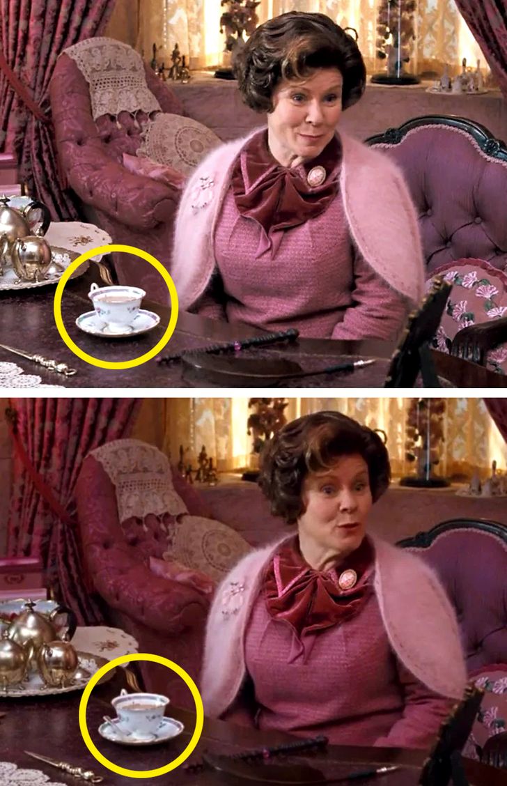 17. Abban a jelenetben, amikor Umbridge kihallgatja Pottert, láthatjuk, hogy nincs kanál a csésze mellett, majd néhány másodperc múlva rejtélyesen ott terem.