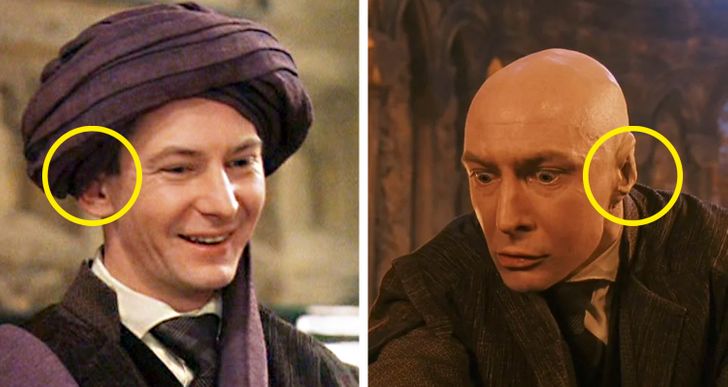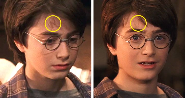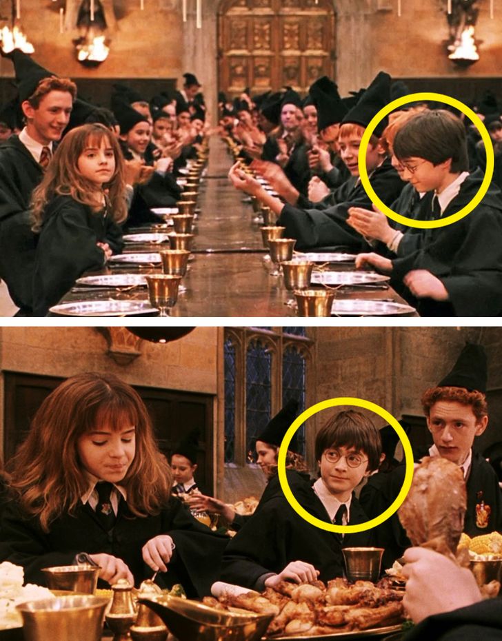 6. Amikor a Teszlek Süveg a griffendéles diákokhoz küldi Harryt, először Ron mellé ül, de a következő jelenetben már Hermione van mellette.