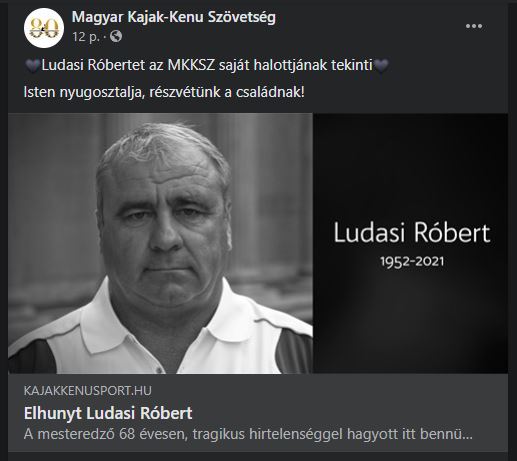 Vasárnap hajnalban, váratlanul, 68 esztendős korában meghalt Ludasi Róbert mesteredző – közölte hivatalos oldalán a Magyar Kajak-kenu szövetség a család tájékoztatása alapján. „A mesteredző 68 évesen, tragikus hirtelenséggel hagyott itt bennünket. Tanítványa volt az utóbbi három évtized szinte összes sikeres magyar kenusa, a fiatalon elhunyt kétszeres olimpiai bajnok Kolonics György, Horváth Csaba, Kozmann György, Kiss Tamás, Csabai Edvin és több más világbajnok versenyző is.” – írja az MKKSZ oldala.