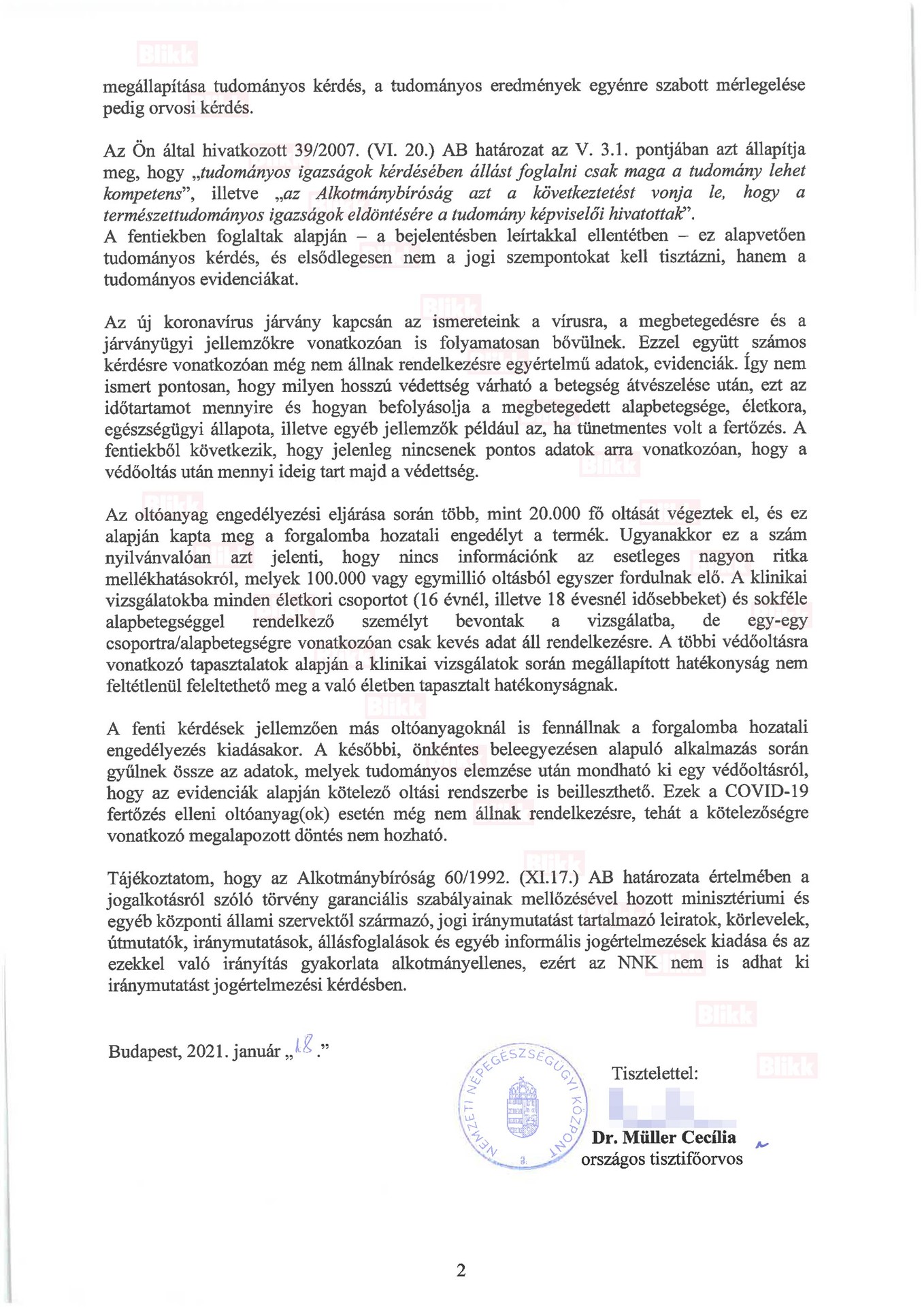 Most megérkezett hozzá Dr. Müller Cecília szakmai válasza, melyben az áll, hogy a védőoltások célja az egészségügyi törvény értelmében egyebek mellett a fertőző betegségek elleni aktív, illetve passzív védelem kialakítása. A törvény szelemében a védőoltások, csakúgy, mint más egészségügyi bevatkozások esetén tudományos alapossággal ki kell vizsgálni, hogy a beavatkozás milyen kedvező eredménnyel járhat, mi a kockázata, illetve teljesülnie kell annak az elvnek is, miszerint a beavatkozás kockázata kisebb legyen a beavatkozás elmaradásával járó kockázatnál. Ennek megállapítása tudományos kérdés, a beavatkozás egyénre szabott alkalmazása pedig orvosi kérdés – áll Müller Cecília levelében, kiemelve, hogy ezeket a dolgokat nem lehet jogi kérdésként kezelni.