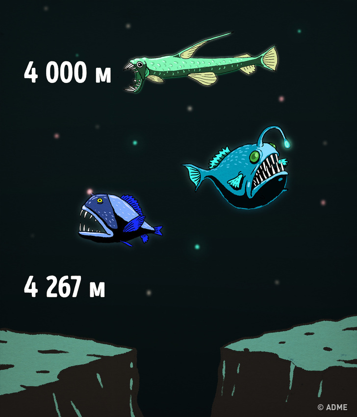 4000 méter: ez a ,,mélytengeri zóna” kezdete. Ezen a ponton túl már olyan szörnyű lények élnek, mint a koboldcápa, a púpos horgászhal vagy az európai horgászhal.