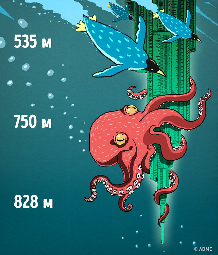 1000 méter: ez az a pont, ahová már a felszínről érkező napfény nem ér el, így itt már teljes a sötétség. A nyomás itt körülbelül ugyanakkora, mintha a Vénusz felszínén állnánk: azonnal összetörné a testünket. Ez persze mit sem zavarja az óriáskalmárokat, akik ebben a mélységben érzik jól magukat igazán.