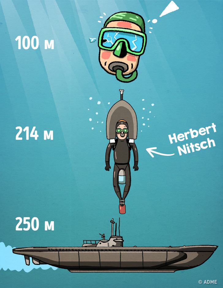 214 méter: az életveszély kockázata sem tántorította el Herbert Nitsch-t, aki könnyűbúvár felszereléssel állította be ezt a világrekordnak számító merülést. A fejére és a lábára nehezékeket raktak, hogy gyorsabb legyen a merülés.